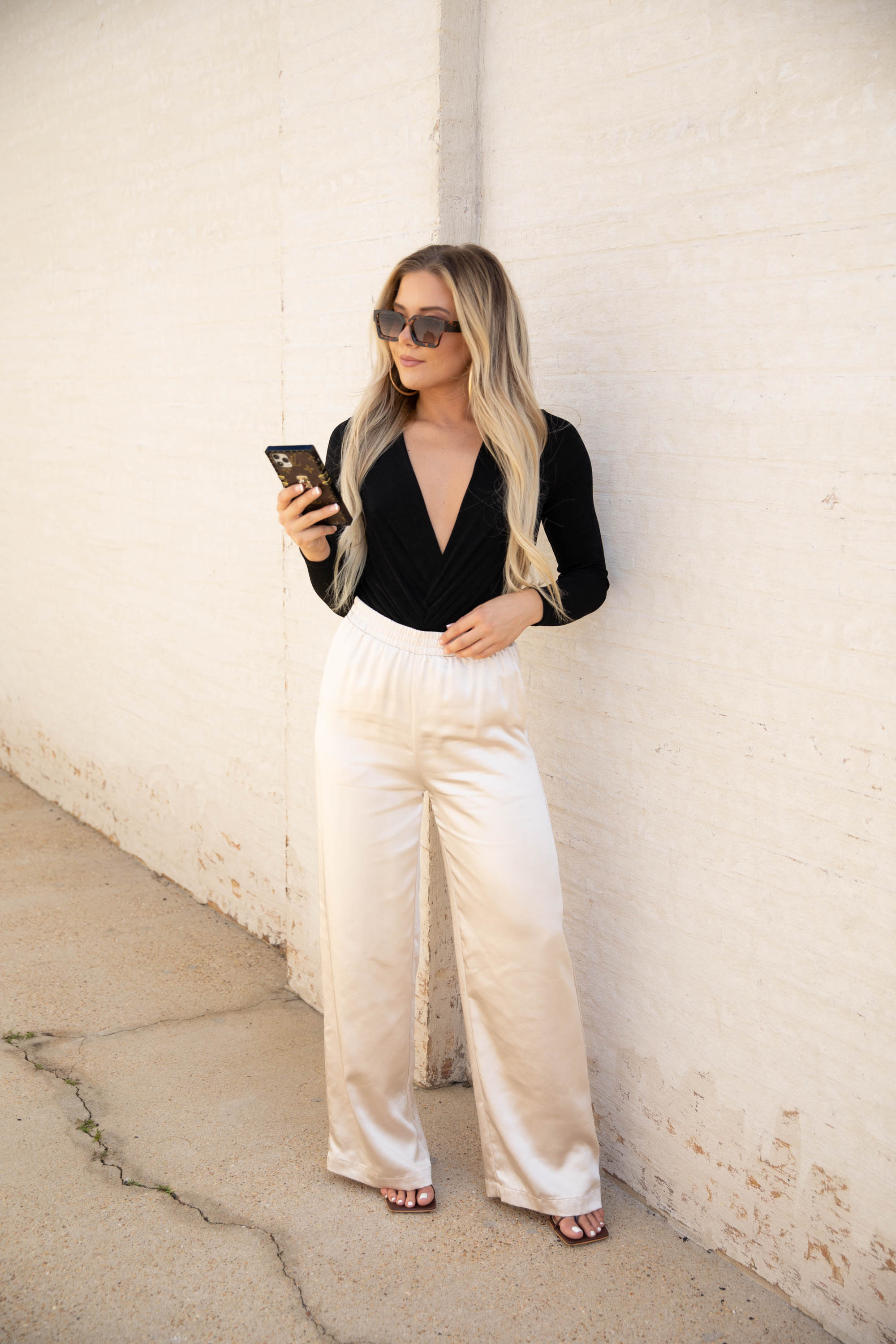 These silky satin pants are a dream! They feature a high elastic waistband, working drawstring, pockets, and straight pant legs making these perfect for the season! 95% Polyester, 5% Spandex.