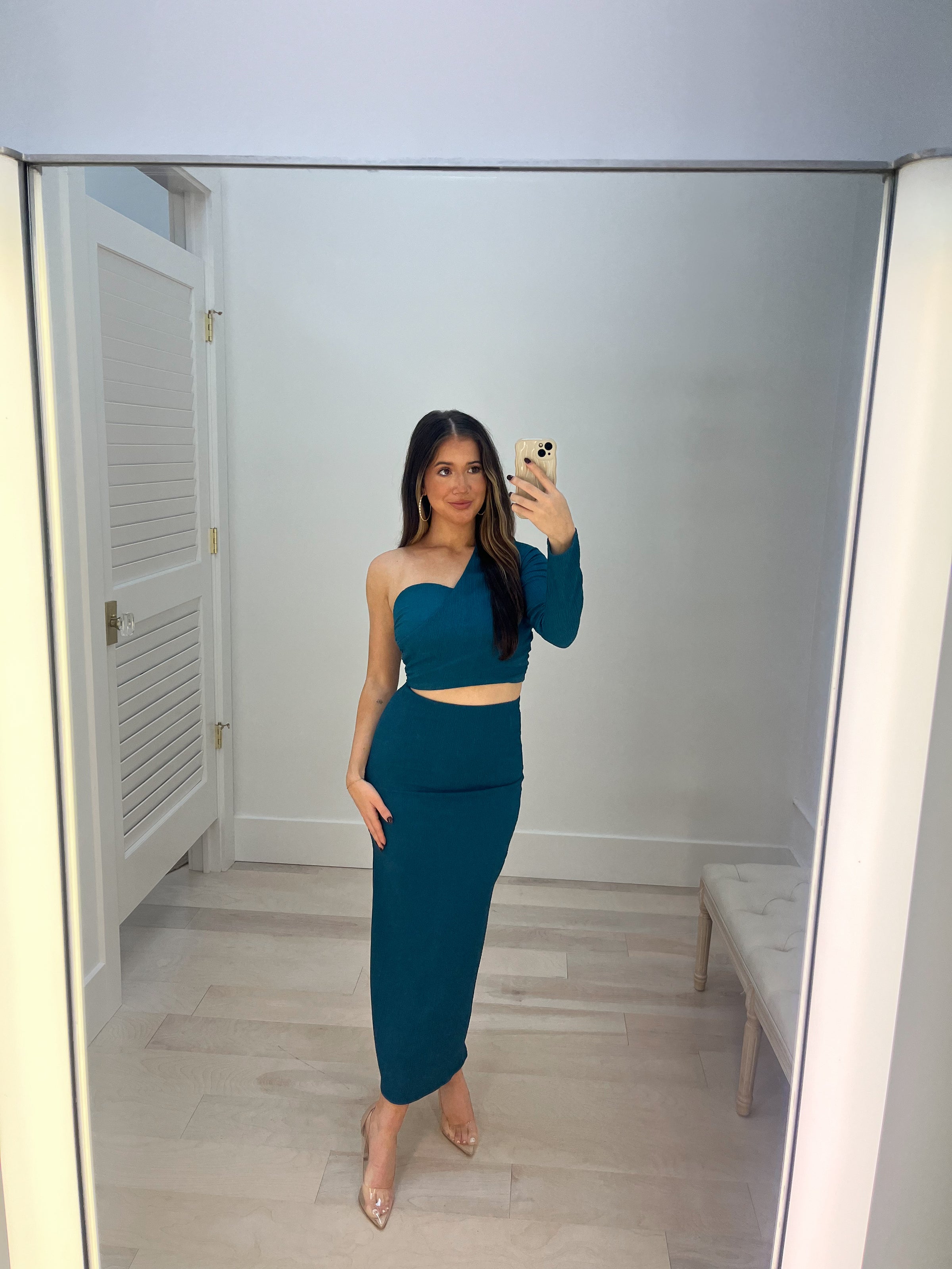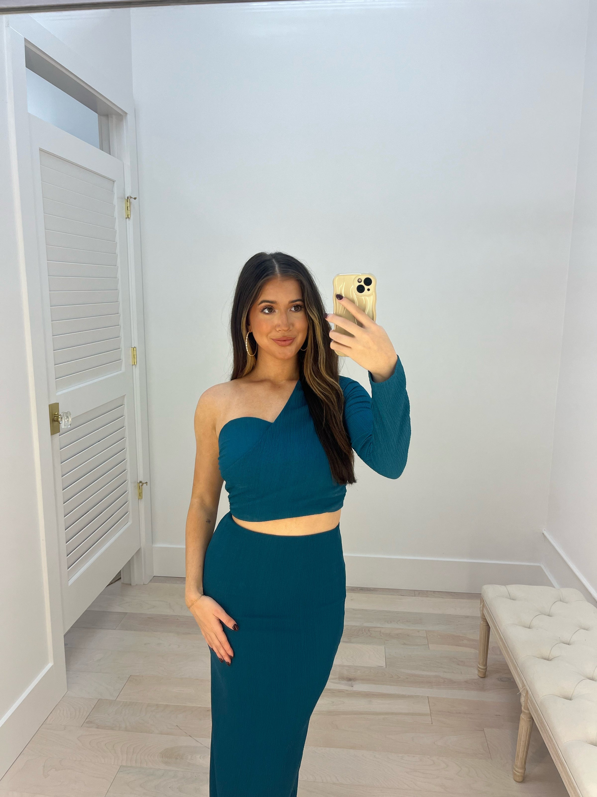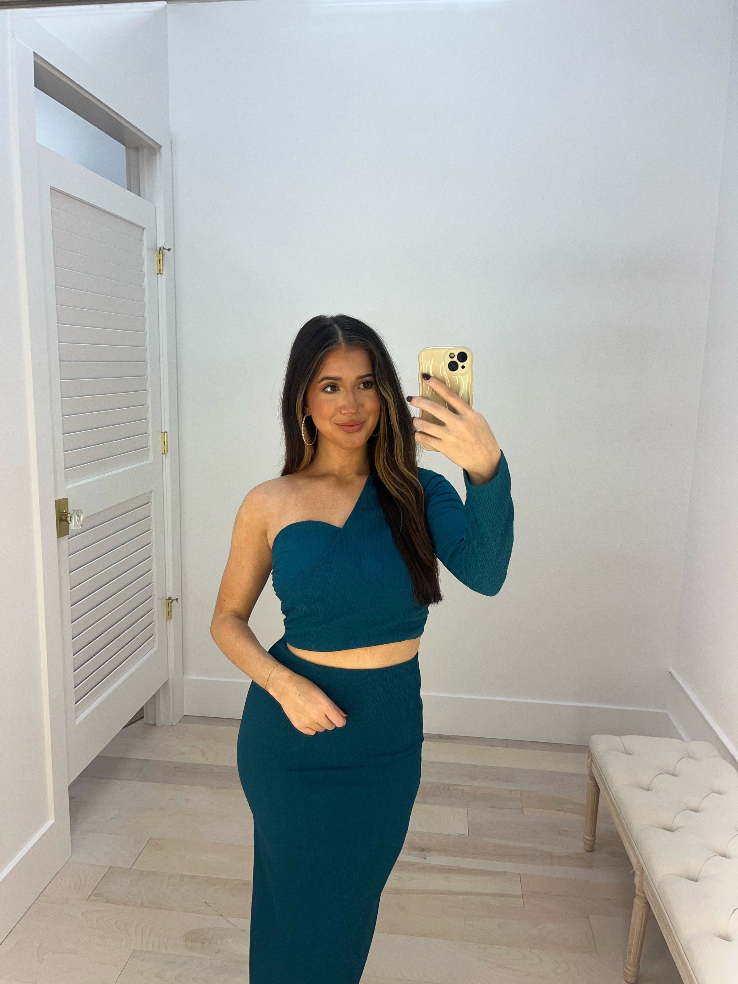 Discover effortless style and sophistication with our Evenings With You Crop top. Featuring a one shoulder design and a trendy crop cut, this top is perfect for any occasion. Complete the look with our matching skirt for a chic and coordinated ensemble. Elevate your wardrobe with this must-have piece.