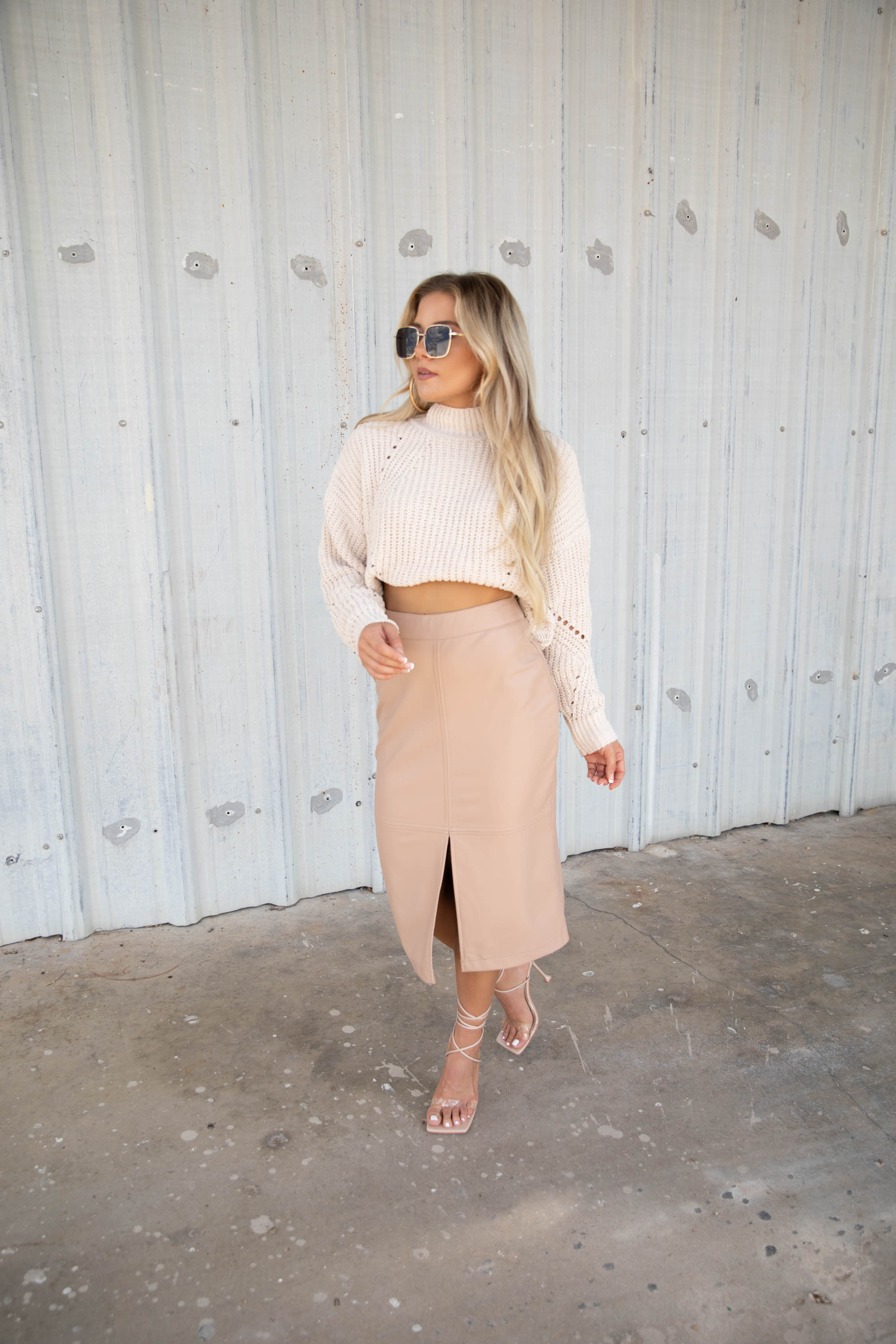 Walk the walk in this sassy skirt! It features a high waistline, midi length, front slit, a faux leather material making it the perfect piece you never knew you needed.
