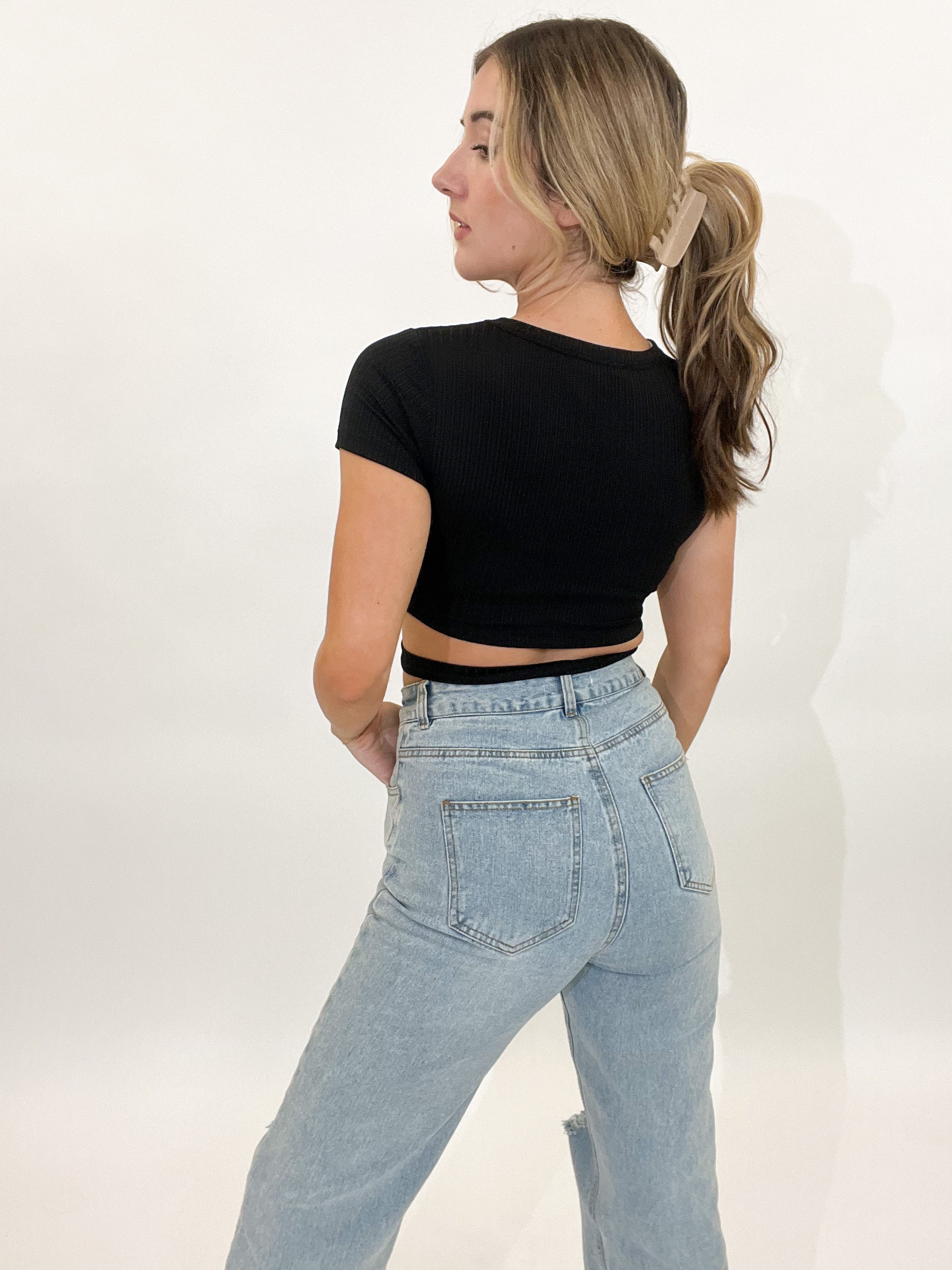 Stay in the loop with today's newest trends! We love the simplicity of this top with a touch of sass. This crop is paired with some white skinnies!