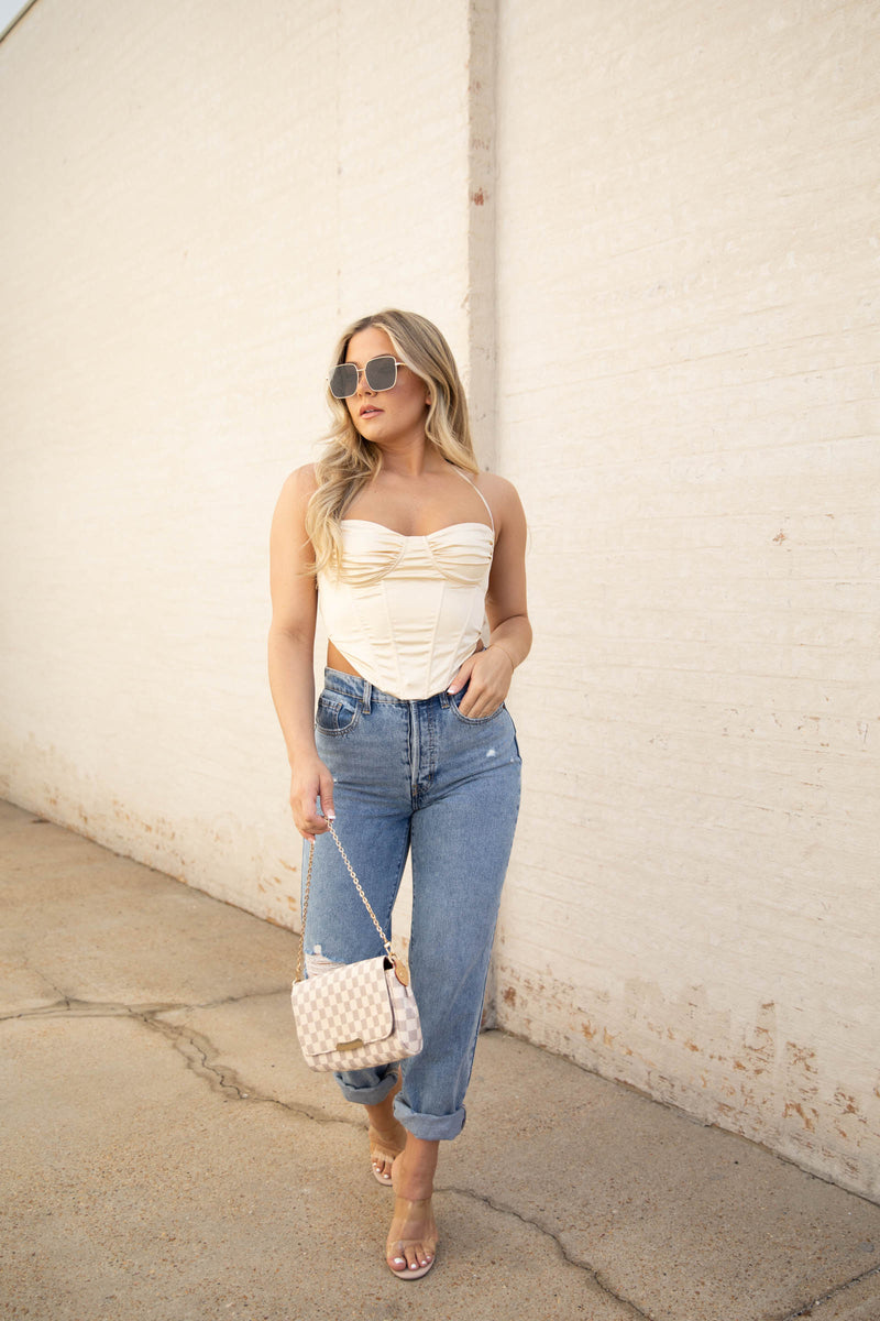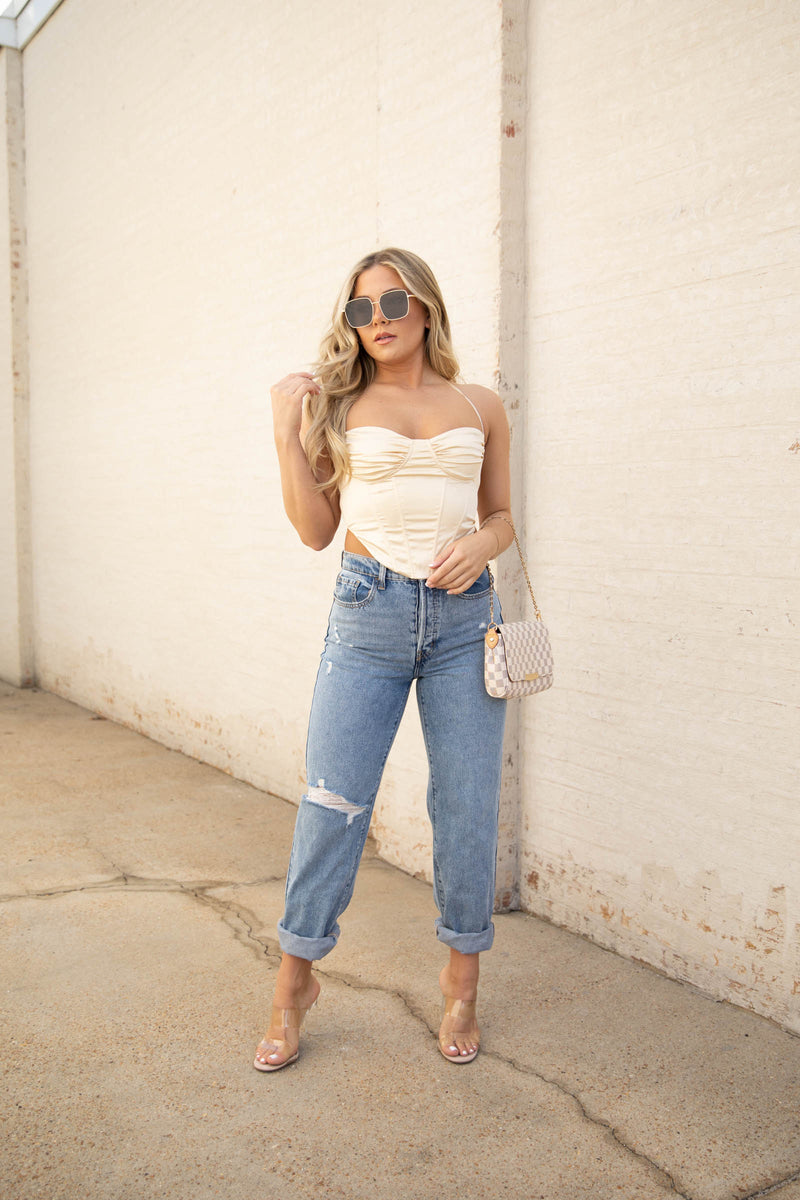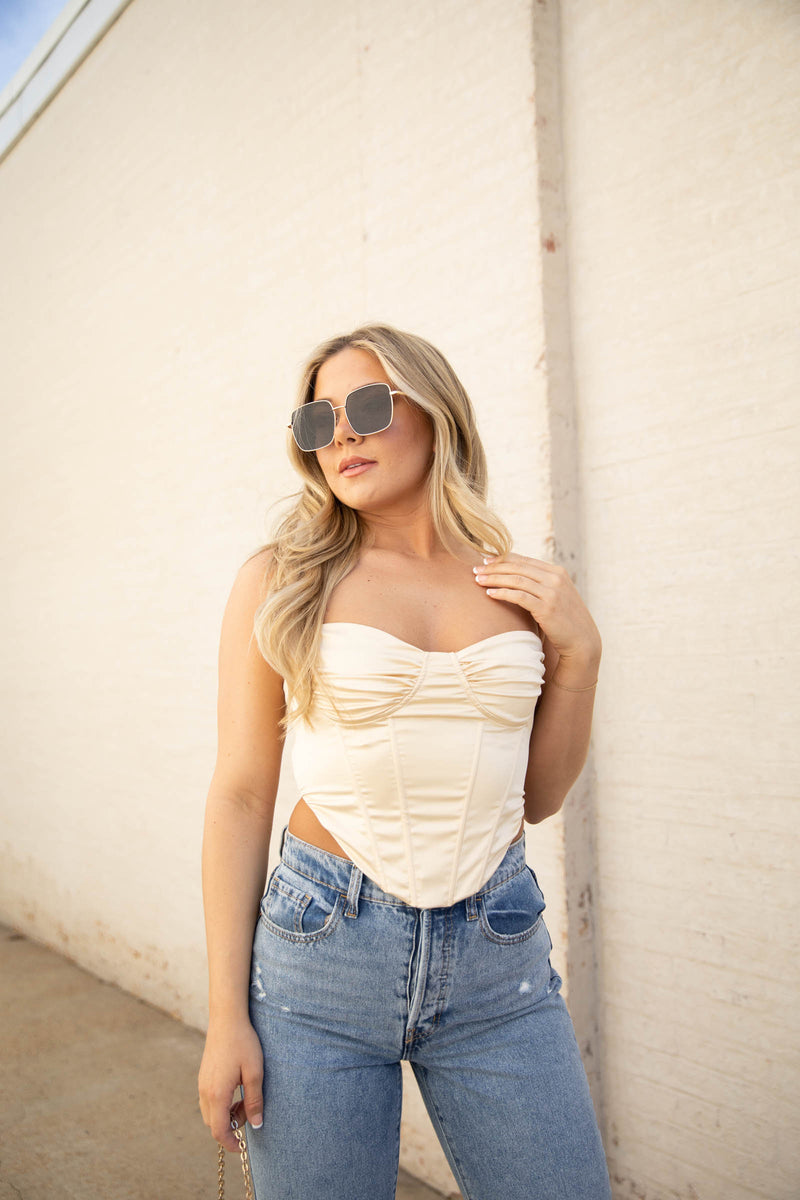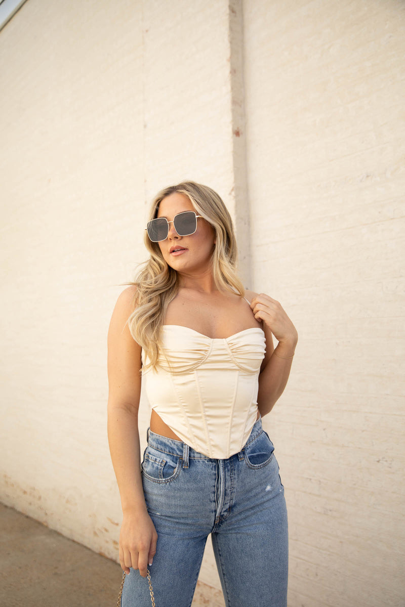 When I look at this gorgeous corset style top, I see Belle. She is beauty but not a beast. This silk crop is perfect and a must have.