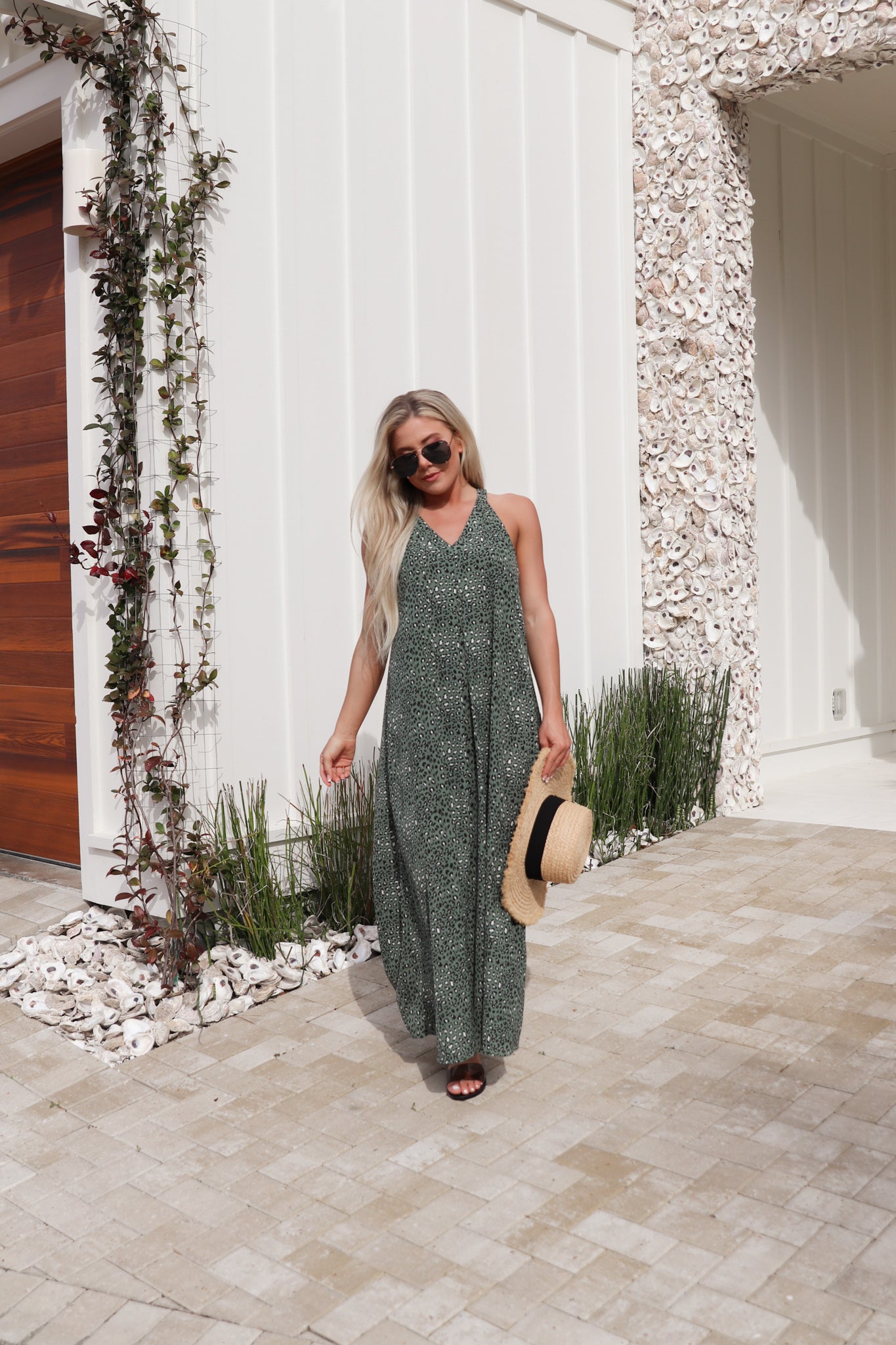 The dress is wildly wonderful making it the perfect piece to pack for a beach vacation! It features a v-neckline, twisted non-adjustable straps, a racerback, and a maxi length making this beauty flowy and super comfortable. Pair it with a straw hat and sandals to complete this beach babe fit!